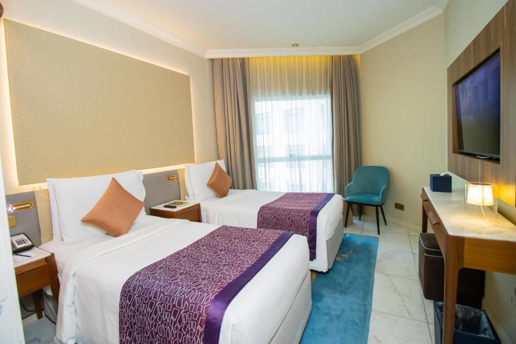 Tilal Jabal AlKabah Makkah is ideally situated in the prestigious Jabal Ka’aba development, just a short walk from the Holy Mosque and close to the city center. The hotel boasts impressive front-facing views of Masjid Al Haram, offering guests a spiritually enriching and convenient stay.